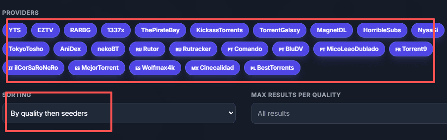 Second, after opening the link above, we'll select the services we want based on Providers, Sorting, etc. I'm selecting all of them here, and for sorting, I'm choosing "by quality then seeders."