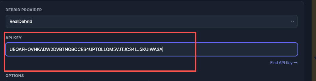 The most important step: Below "Exclude Resolutions" is the "Debrid Provider" section. The first option is Real Debrid—select it, then enter your API key. You can find instructions for getting your API key at the bottom of the input box—click "Find API Key" and it'll take you to https://real-debrid.com/